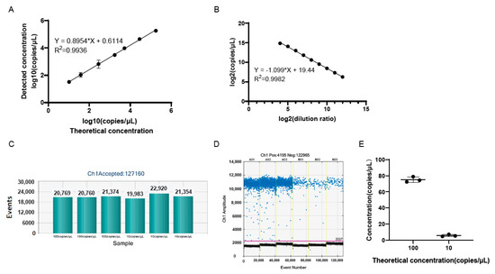 The gH plasmid DNA was serially diluted for the detection of the genomic copy number by ddPCR. As shown in Figure 3A, there was good linearity between the logarithm of the genomic copy number and the logarithm of the dilution ratio, with the linear correlation coefficient, R2, being 0.9936. This suggested that circular DNA could also be suitable for detection by ddPCR.