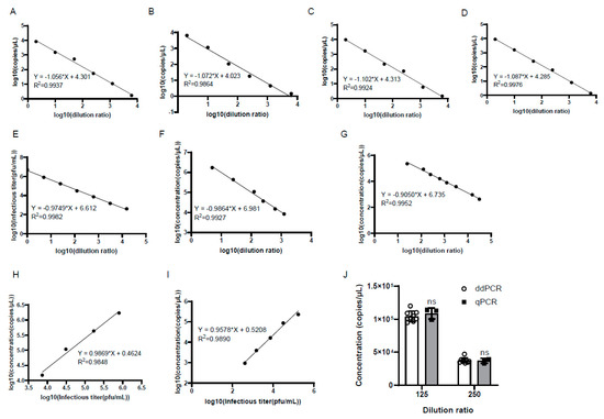 To verify the accuracy of the ddPCR detection, the genomic copy number of the serially diluted viruses was determined by quantitative PCR (qPCR) and ddPCR in parallel, and the infectious titer was measured by plaque assay as well. The results showed that there was a good linear correlation between the logarithm of the infectious titer and the logarithm of the dilution ratio (Figure 4E). Meanwhile, good linearity was also observed between the logarithm of the genomic copy number and the logarithm of the dilution ratio detected by qPCR and ddPCR, respectively (Figure 4F,G). Notably, the slopes of the linear equations obtained by the three methods were very similar to each other (Figure 4E–G). To evaluate the accuracy of ddPCR, the linear dependence of the logarithm of the genomic copy number by qPCR and ddPCR with the logarithm of the infectious titer was calculated, and good linear correlations were observed, with similar slopes of 0.9869 and 0.9578, respectively (Figure 4H,I). Then, the genomic copy number of the samples diluted 125-fold and 250-fold were compared between ddPCR and qPCR, and the results showed that there was no significant difference in the genomic copy number of the samples diluted at the same fold detected by the two methods (Figure 4J).