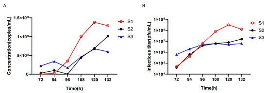 The genomic copy number of oHSV-1 in different hours cultured in a bioreactor. (A) The culture conditions were different in the S1, S2, and S3 batches. The x-axis represents different hours after oHSV-1 infection, and the y-axis represents the DNA copy numbers per milliliter. (B) The viral infectious titers under different culture conditions were measured. The x-axis represents different hours after oHSV-1 infection, and the y-axis represents the infectious titer.