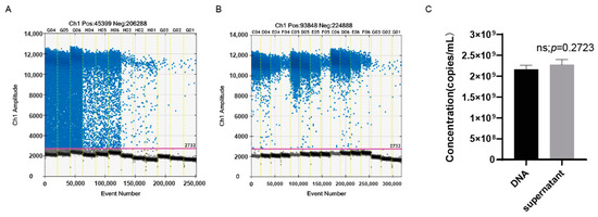 The genomic copy number measured without the extraction of viral DNA was comparable to that of the extracted DNA. (A) The 1D amplitude of the samples without the extraction of viral DNA. The positive and negative droplets were labeled with blue and black dots, respectively. The threshold was indicated by the pink line. (B) The 1D amplitude of the samples after the extraction of viral DNA. (C) The genomic copy numbers per milliliter of the purified virus with or without the extraction of viral DNA. DNA: detection after the extraction of viral DNA; supernatant: detection without the extraction of viral DNA.