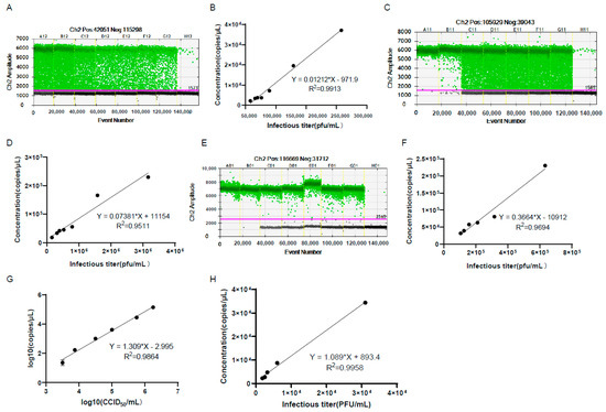It usually takes 2–4 days for virus titration by CCID50 or plaque assay, so it would be very convenient to use the genomic copy number to calculate the viral infectious titer using a certain formula. For this purpose, we measured the virus infectious titer by plaque assay and the genomic copy number of the harvested and purified virus without extraction of viral DNA by ddPCR (Figure 7A–D). The results showed that there were good linear relationships between genomic copy numbers and the viral infectious titer. After the DNA extraction of the purified virus, the genomic copy numbers also showed a good linear relationship with the viral infectious titer (Figure 7E,F). In order to reflect the linear relationship more truly between the genomic copy number and the infectious titer, the viral infectious titers were detected by CCID50 or plaque assay after multiple dilutions, and the genomic copy numbers were detected at the same time by ddPCR. The results showed that the genomic copy numbers also showed good linear relationships with the viral infectious titer (Figure 7G,H).