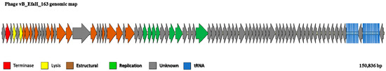 Annotation, combining the RAST, PATRIC, and BLAST results, revealed the existence of 186 orfs and 21 tRNAs. Most of these orfs (81%) showed no similarity to genes of a known function and were consequently annotated as coding for hypothetical phage proteins. Genes for which a putative function could be assigned were mainly related to basic phage functions such as packaging (large terminase unit), lysis (endolysins with a muramidase domain), structural proteins (portal, major head, tail sheaths, tail measure, base plate), or replication (helicase, primase, DNA polymerase) (Supplementary Table S1; Figure 3). These genes are functionally grouped into modules that are all transcribed in the same direction (Figure 3), except for a small group of orfs of unknown function, as well as the tRNA genes, which are divergently transcribed (Figure 3). No genes involved in the establishment of a lysogenic cycle were found, suggesting that vB_EfaH_163 is a lytic bacteriophage. No genes related to pathogenicity, virulence (including toxin-encoding), or AMR were detected either, supporting the idea that vB_EfaH_163 could be therapeutically used without danger. The vB_EfaH_163 DNA packaging mechanism was determined in silico using the Phageterm tool, suggesting a mechanism of long direct terminal repeats, similar to that seen in phage T5 [53]. The size of the terminal repeat was estimated at 2105 bp between positions 104,991 and 107,095 of the reported genome sequence (Accession number CAJDKA010000002.1). As most of the phages with this type of packaging have a circular genome, but the obtained genome was a linear contig, a PCR amplification using primers located at both contig ends was performed. The sequencing of the resulted amplicon allowed confirmation that the genome is circular and to correct the genome sequence.