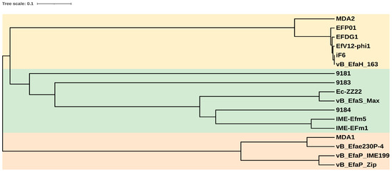 The amino acidic sequence of the major capsid protein of vB_EfaH_163 was aligned with those of other E. faecium-infecting phages for which complete genomes are available (Table 2). This was achieved using the unweighted pair group method with arithmetic means (UPGMA) and employing MAFFT v.7 software (https://mafft.cbrc.jp/alignment/server/ [41] accessed on 14 November 2022). The phylogenetic tree produced was visualized using the iTOL web server (https://itol.embl.de/ [42] accessed on 14 November 2022).