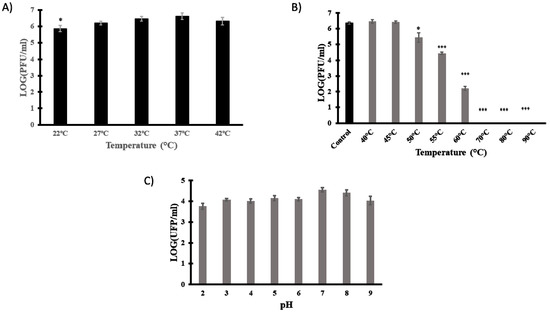 Technological characterisation of phage vB_EfmH_163. The effect of incubation temperature (22, 27, 32, 37, and 42 °C) (A), thermal stability (15 min-treatment at 40, 45, 50, 55, 60, 70, 80, or 90 °C) (B) and pH stability (15 min treatment in PBS pH 2–9) (C) were assessed by measuring the phage titre (Log PFU/mL). Means and standard deviations of three independent replicates are shown. *: p < 0.05; ***: p < 0.001.