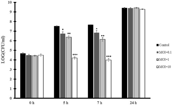 Biocontrol assay. E. faecium VR-13 104 CFU/mL culture infected with phage vB_EfmH_163 at different MOIs (0.1, 1, and 10). Viable cells (CFU/mL) were counted at 5 h, 7 h, and 24 h post-infection. Means and standard deviations of three independent replicates are shown. *: p < 0.05; **: p < 0.01; ***: p < 0.001.