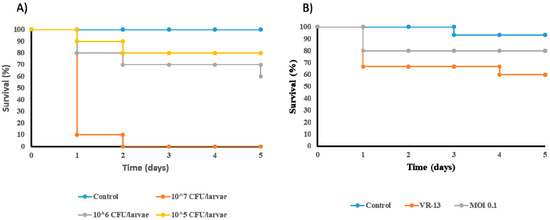 To test the lethality of E. faecium VR-13, an overnight culture of this bacterial strain was centrifuged for 10 min at 3500 rpm and the pellet resuspended in the same volume of PBS. To determine what concentration of larvae to use in experiments, 10 µL of the above suspension were injected into the right pro-leg at test concentrations of 105–107 CFU/larva, as previously described [52]. A group of larvae was injected with PBS as a control (see Section 3.6 for details). After inoculation, the larvae were kept in Petri dishes at 37 °C, and the number of deaths monitored for five days.