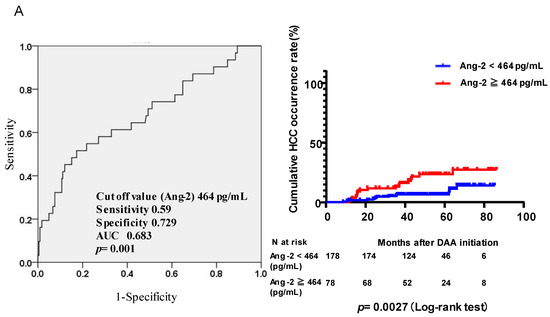 We defined the optimal cut-off values for baseline age and serum Ang2 levels by receiver-operating characteristic (ROC) analyses for predicting HCC occurrence after successful HCV eradication by DAAs. The optimal cut-off value for baseline Ang2 was set at 464 pg/mL (sensitivity, 0.59; specificity, 0.729; AUC, 0.683; p = 0.001) (Figure 2A). A comparison of cumulative incidences of HCC occurrence (%) revealed that patients with baseline serum Ang2 level < 464 pg/mL had a significantly lower risk of HCC incidence than those with baseline serum Ang2 level ≥ 464 pg/mL (p = 0.0027) (Figure 2A). Estimated cumulative incidences of de novo HCC at two and four years after the initiation of DAA therapy were 11.7% and 23.5% in the Ang2 ≥ 464 pg/mL group and 3.4% and 6.6% in the Ang2 < 464 pg/mL group, respectively.