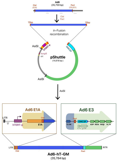 Construction of Ad6-hT-GM. pShuttle is based on pBR322 and contains the left part of the Ad6 genome from LITR to 1773 bp (shown in yellow) with hTERT promoter (shown in purple) replacing the native E1A promoter and the right part, from 27,576 bp to RITR (shown in green) with the GM-CSF transgene inserted instead of E3-6.7K and E3-gp19K genes (shown in cyan). pShuttle was linearized by amplification with primers containing 15 nucleotide homology arms (shown in orange). The Ad6 genome was digested with ClaI and PacI, and recombination between truncated genome and linearized pShuttle was performed by the In-Fusion kit. Ad6-hT-GM recombinant virus genome was then retrieved from the plasmid with the AsiSI. Expanded regions indicate modified Ad6-hT-GM genome regions.