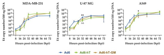 The influence of genome modifications on the rate of adenoviral replication in various cell lines. MDA-MB-231, U-87 MG, and A549 were infected with Ad6, Ad6-hT, and Ad6-hT-GM with MOI = 100 vp/cell, and DNA copy numbers were assessed at various time points by qPCR with primers for adenoviral E4 region. Data are presented as mean ± SD (n = 3). The differences between viral copy numbers were analyzed by ANOVA followed by Tukey’s HSD post-hoc test for pairwise comparisons. * p < 0.05 and ** p < 0.01 denote significant differences between Ad6-hT and Ad6. ΔΔ p < 0.01 denotes significant difference between Ad6-hT-GM and Ad6.