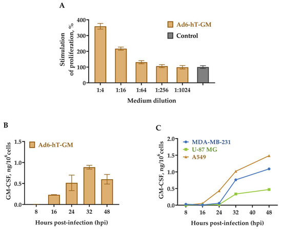 GM-CSF production by Ad6-hT-GM-infected cells. (A) Stimulation of TF-1 cells proliferation by GM-CSF. A549 cells were infected with Ad6-hT-GM at MOI = 100 vp/cell, supernatant was collected after 48 h. Supernatant collected from mock-infected cells was used as a control. Stimulation of TF-1 cells proliferation was determined by XTT assay following a 72 h incubation. Data from the mock-infected group was normalized to 100%. Data are presented as mean ± SD (n = 3). (B) Dynamic of GM-CSF expression in A549 cells. Cells were infected with Ad6-hT-GM (MOI = 100 vp/cell); at various time points, infected cells were incubated with fresh medium for 1 h before collection and measured for GM-CSF concentration by ELISA. Data are presented as mean ± SD (n = 3). (C) Dynamic of GM-CSF production in various Ad6-hT-GM-infected cell lines. A549, MDA-MB-231, and U-87 MG cells were infected with MOI = 100 vp/cell; medium was collected, and GM-CSF concentration was measured by ELISA.