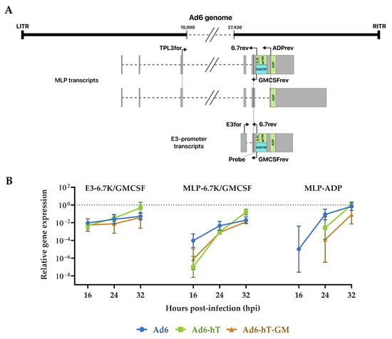 Samples were treated with DNase I to get rid of genomic DNA before proceeding to analysis (Thermo Fisher Scientific, Waltham, MA, USA). Reverse transcription was performed with oligo-dT primer using an MMLV reverse transcription kit (Evrogen, Moscow, Russia). Quantitative PCR was performed on the CFX96 Touch Real-Time PCR Detection System. Specific primers and the probe (Table S1, primers #15–20) were designed to amplify E3 genes 6.7K, GM-CSF and ADP from the E3 promoter or major late promoter (MLP).