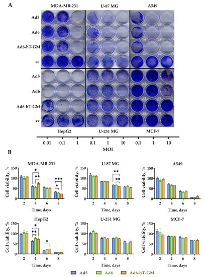 To evaluate the cytotoxic effect of Ad6-hT-GM compared to the wild-type Ad5 and Ad6, a panel of human cancer cell lines of different origins were used: A549 (lung cancer), MDA-MB-231 and MCF-7 (breast cancer), U-87 MG and U-251 MG (glioblastoma), and HepG2 (hepatocarcinoma). Cell viability was determined by the crystal violet assay on the 8th day post-infection, dpi (Figure 5A). HepG2 showed the highest sensitivity to all three tested viruses among all cell lines while A549 and MDA-MB-231 cells were less sensitive. However, the wild-type Ads cytotoxicity overcame Ad6-hT-GM on the HepG2 and MCF-7 cell lines, suggesting slight Ad6-hT-GM lytic ability attenuation level due to the hTERT/GM-CSF insertions.