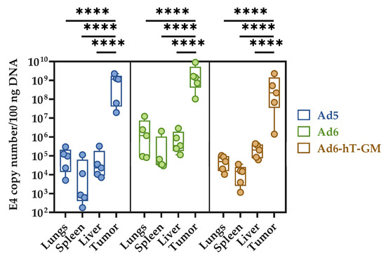 Adenoviral genomic DNA biodistribution in mice organs and tumors. E4 gene copy number per 100 ng of total DNA within the lung, spleen, liver, and tumor was evaluated using qPCR. The tumors demonstrated significantly higher DNA copy numbers compared to the organs (**** p < 0.0001). Data are presented as the Dot-boxplots, with n = 5 animals per group. The differences between cell viability levels were analyzed by ANOVA followed by Tukey’s HSD post-hoc test for pairwise comparisons.