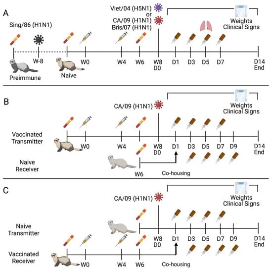 Ferrets were directly infected either to establish pre-immunity before vaccination (Sing/86) or to challenge the vaccine groups for protection characteristics (CA/09, Viet/04, and Bris/07). Direct infection was performed intranasally with 1 mL total volume with 500 μL administered to each naris. The infection dose used for Sing/86, CA/09, and Bris/07 was 1 × 106 plaque-forming units (PFU)/mL. Whereas the infection dose used for Viet/04 was 1 × 105 PFU/mL. After infection, animals were observed twice daily for clinical signs and weighed once daily until two consecutive days without signs. On days 1, 3, 5, and 7 post-infection (p.i.) nasal washes were performed with 3 mL of sterile PBS.