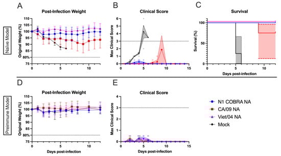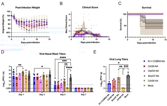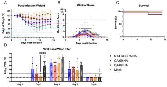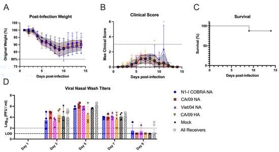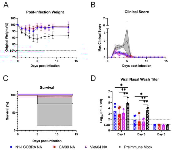NA-vaccinated ferrets pre-immunized with Sing/86 H1N1 exhibited minimal clinical signs after intranasal infection with CA/09 H1N1. (A) After infection with CA/09, the weight during infection was normalized to the percentage of the original starting weight before infection. (B) The maximum clinical scores from the morning and evening checks were displayed with a score of three or greater indicating clinical endpoint. Individual ferret clinical scores are shown with the line connecting the mean score and the range of the standard error of the mean shaded. (C) The survival percentage for each group was determined. The 95% asymmetrical confidence intervals are shown as shadow for the groups that did not have 100% survival. (D) The nasal wash titers for all vaccinated groups were determined through plaque assay. The limit of detection (LOD; dashed line) was 1.0 log10(PFU/mL), and the limit of quantification (dotted line) was 2.0 log10(PFU/mL). A two-way repeated measures ANOVA and Dunnett’s test for multiple comparisons was used for statistical analysis with the mock-vaccinated as the control group. All error bars represent standard deviation. The minimum weight before clinical endpoint was 75%, with 80% denoting an increase in clinical scoring. Adjusted p-value: * ≤ 0.05, ** ≤ 0.01.