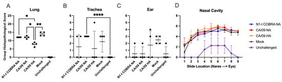 N1-I COBRA NA vaccine induced similar inflammation in the upper and lower respiratory tract as the CA/09 HA and CA/09 NA vaccines in naïve ferret model after intranasal infection with CA/09 H1N1. H&E-stained formalin-fixed and embedded tissues were scored for the severity and distribution of inflammation. (A) The NA-based vaccines had the same mean severity score and were significantly greater than the CA/09 HA vaccine group. All groups were significantly different (p < 0.01) compared to the unchallenged group (not shown). (B) The trachea was examined for inflammation and the CA/09 NA-vaccinated group had higher incidence and mean severity scores compared to all other groups. (C) The inflammation in the middle and inner ear was mild. The mock group had 100% incidence. (D) Sections of the nasal cavity from the nares to the eye were examined for inflammation. All challenged animals had similar group histopathological scores compared to the unchallenged group, in which the histopathological score was representative of background, non-significant inflammatory cellular infiltrates. A two-way repeated measures ANOVA with Tukey’s test for multiple comparisons was used for statistical analysis of the lung, trachea, and ear sections, and the same analysis conducted separately for the nasal cavity sections. Adjusted p-value: * ≤ 0.05, ** ≤ 0.01, **** ≤ 0.0001.