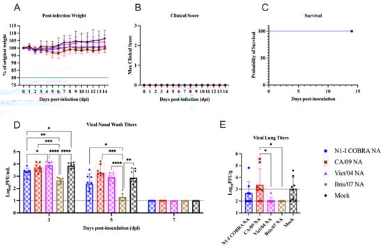 3.1. N1-I COBRA NA Mitigated Clinical Signs and Viral Titers in Naïve Ferrets Directly Challenged with CA/09 H1N1