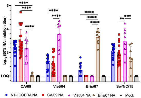 N1-I COBRA NA vaccine elicited NA-inhibiting antibodies to a panel of genetically diverse HXN1 viruses. The 50% NA inhibition (NAI) titers elicited by the NA-based vaccines were measured for a panel of N1 influenza viruses that belong to different N1 genetic clades. Non-linear regression of the ELLA results using RDE treated ferret sera was used to determine the 50% NAI titers (Supplementary Materials). The N1-I COBRA NA vaccination elicited inhibitory antibodies to viruses in the panel. The CA/09 NA and Viet/04 NA elicited cross-reactive NAI antibodies to each other. The Bris/07 NA vaccine elicited NAI antibodies to itself. All NA vaccines elicited antibodies that inhibited the SW/NC/15 virus. The initial serum dilution used for the ELLA assay (1:100) was defined as the limit of quantification at 2.0 log10 (50% NAI titer). All error bars represent standard deviation. Adjusted p-value: ** ≤ 0.01, *** ≤ 0.001, **** ≤ 0.0001.