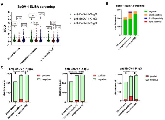 BoDV-1 screening ELISA. Three cohorts of healthy blood donors (n = 216), outpatients after solid organ transplantation (n = 280), and patients with requested TBE diagnostics (n = 288) were screened for anti-BoDV-1-IgG antibodies by an ELISA system using recombinant viral nucleocapsid (N), X, or phosphoprotein (P) as antigens. (A) shows the signal-to-cut-off ratios (S/CO) for individual samples and percentages of reactive samples for each cohort and antigen. Fractions of samples with IgG antibodies directed against none (negative), one (single positivity), two (double positivity), or three antigens (triple positivity) are depicted in (B). (C) shows the absolute counts of negative and reactive samples for each group and antigen. The variables “cohorts” and “test outcome” were statistically dependent for anti-BoDV-1-N-IgG (p = 0.0012) and anti-BoDV-1-P-IgG (p < 0.0001) based on chi-square tests. As post hoc test, the p-values of residuals were analyzed using Bonferroni correction. Residuals were significantly elevated for outpatients after solid organ transplantation (anti-BoDV-1-N-IgG, anti-BoDV-1-P-IgG) and significantly diminished for patients with the requested TBE diagnostics (anti-BoDV-1-P-IgG), as indicated by an asterisk.