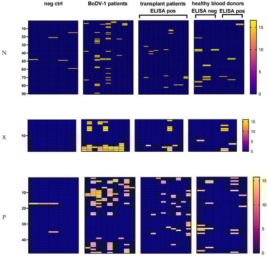 For this approach, three peptide macroarrays on cellulose membranes were used (Figure S3). Whole BoDV-1 N, X, and P proteins were covered by 15-mer peptides with an overlap of 11 amino acids to neighboring peptides. ELISA and immunoblot positive samples were available for nine BoDV-1 patients. For each patient, one sample (serum/plasma or CSF) was tested. Five sera of patients with a brain biopsy that tested negative for BoDV-1 RNA in RT-qPCR analysis and with a negative serology result (ELISA and iIFA) were included as negative controls. In addition, 9–10 samples from the transplant cohort as well as 3 samples from the blood donor cohort, all false-reactive in the ELISA screening, were tested on the corresponding membrane. Three ELISA negative samples from the blood-donor cohort were included for comparison. For analysis, the base 2 logarithm of background-corrected spot intensities was used. An arbitrary cut-off of 13.5 was established in order to minimize unspecific staining for samples from the negative control.