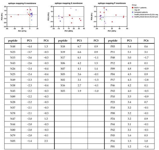 As an overall analysis, a principal component analysis (PCA) was performed for the samples tested on each membrane (Figure 4). Samples belonging to patients with BoDV-1 infection were easiest to cluster based on the PC1 and PC3 of the X membrane analysis, whereas only four patients with BoDV-1 infection clustered together based on the analysis of the N and P membrane. Loadings of PC contributing most to separation helped to identify peptides or the combination of peptides indicating ELISA results correctly identified as positive. Samples with false-reactive ELISA results did not uniformly cluster.