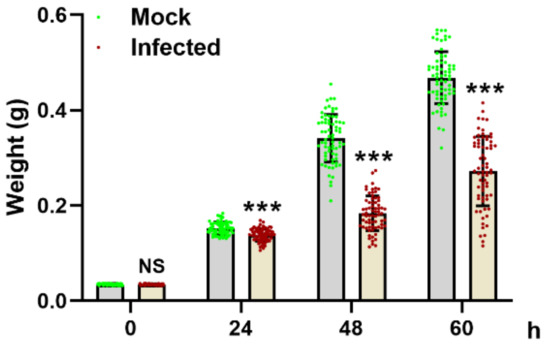 Effect of MbMNPV infection on body weight of H. armigera. ns, p > 0.05; ***, p < 0.001; p < 0.05 indicated the significant difference (Student’s t-test). Each experiment was performed in three replicates, and data are shown as mean ± s.e.m.