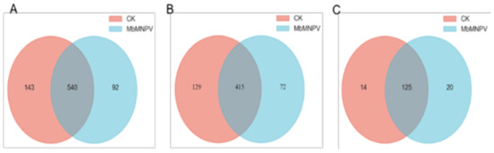 Mock-infected and MbMNPV-infected larvae consisted of three repeats labeled as CK-1, CK-2, and CK-3 and MbMNPV-1, MbMNPV-2, and MbMNPV-3, respectively. At 72 h post-infection (hpi), total RNA was extracted using the mirVana miRNA Isolation Kit (Ambion) according to the manufacturer’s protocol. The RNA quality and purity were evaluated using agarose gel electrophoresis, Nanodrop microvolume spectrophotometer, and Agilent 2100 Bioanalyzer.