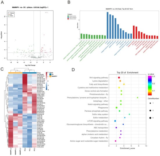 Screening and enrichment analysis of DEmiRNAs in MbMNPV-infected group compared with control group. (A) The volcano map of different miRNA. (B) Top 30 significantly enriched GO terms of predicted targets for DEmiRNAs in molecular function, cellular components, and biological process. (C) Hierarchical clustering analysis (heatmap) for DEmiRNAs. (D) Top 20 significantly enriched KEGG analyses of predicted targets for DEmiRNAs.