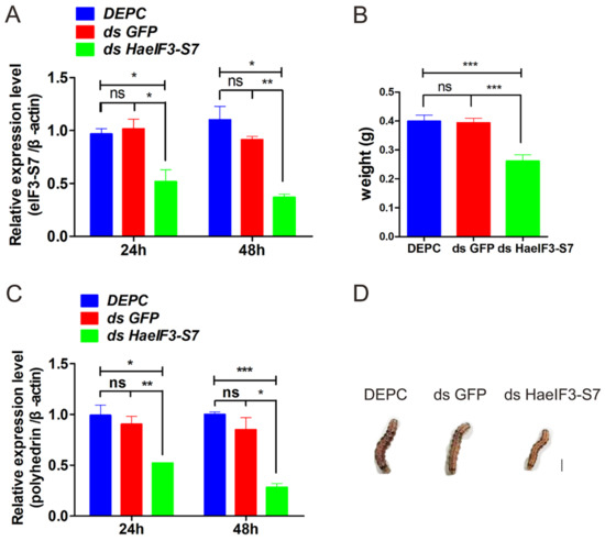 The effects of HaeIF3-S7 RNAi on the larvae. At 1d fifth-instar, larvae were injected with dsRNA of HaeIF3-S7 (ds eIF3-S7), dsRNA of green fluorescent protein (dsGFP), and DEPC (control). (A) The expression levels of the eIF3-S7 gene. (B) The expression levels of the polyhedrin gene. (C,D) The MbMNPV-infected larvae weight were analyzed. The standard error is represented by the error bar. ns, p > 0.05; *, p < 0.05; **, p < 0.01; ***, p < 0.001; p < 0.05 indicate significant difference (Student’s t-test). Each experiment was performed in three replicates, and data are shown as mean ± s.e.m.