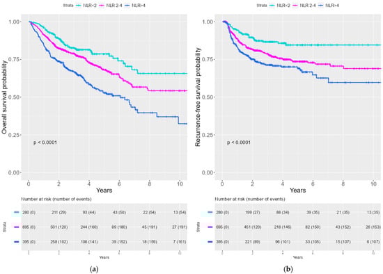 Kaplan–Meier curves of OS and RFS stratified by NLR tertile (a) Kaplan–Meier curves of OS by NLR tertile (b) Kaplan–Meier curve of RFS by NLR tertile.