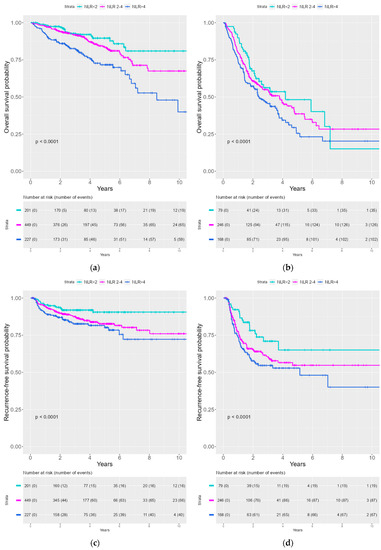 The NLR was obtained by dividing the total pretreatment neutrophil count with the total pretreatment lymphocyte count per patient. Ferrandino et al. grouped patients in three groups with NLR-cutoffs for investigating OS of 2.1 and 3.4 while the cutoffs were 2.3 and 3.7 for cancer-specific survival (CSS) []. Rachidi et al. examined the effect of NLR on OS in HNSCC and divided patients in three groups with NLR-cutoffs 2.36 and 4.39 []. Other studies divided patients in two groups using NLR-cutoffs of 2.42 and 3 [,,]. Based on these previous studies, we chose to separate our patient cohort in three groups of NLR < 2, NLR 2–4, and NLR > 4.