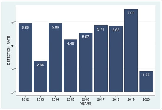 Annual trends in HcoV positivity rates (positives/samples tested), 2012–2020.