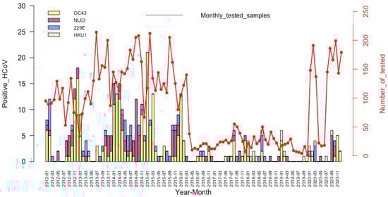 Temporal distribution of the HCoV detections among patients with an influenza-like illness, by month and year.