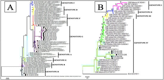 Phylogenetic analyses of HCoV-OC43 (A) and HCoV-229E (B) strains detected in patients with ILI/SARI, between 2012 to 2020, in Senegal. The phylogenetic trees are based on nucleotide sequences of the spike protein gene generated using the maximum likelihood tree with the Tamura–Nei evolutionary model, as implemented in MEGA 7 software. One thousand bootstrap replicates were performed to determine the consensus tree presented in this figure, and support for the nodes present in greater than 70% of the trees are annotated. Senegalese strains are represented in black dots.