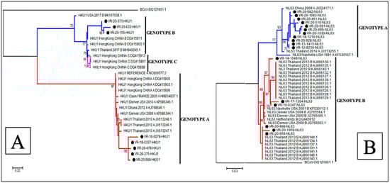 The phylogenetic analysis showed that of the 22 sequences of HCoV-OC43, 18 (81.8%) belonged to genotype G, 3 (13.6%) to genotype H and only 1 (4.5%) sequence clustered to genotype F (Figure 3A), whereas all the 6 HCoV-229E sequences obtained in this study belonged to genotype 4 (Figure 3B). With regards to HCoV-NL63, 11 (64.7%) sequences were identified as belonging to genotype A and 6 (35.3%) to genotypes B (Figure 4B). Among the eight sequences obtained for HCoV-HKU1, three (37.5%) clustered to genotype B and five (62.5%) to genotype A (Figure 4A).