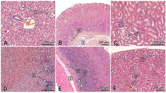 The organs of rats 1 day after the multiple-dose administration of the substance NIOCH-14 (150 µg/g body weight) once daily during 30 days was stopped. (A–C)—males; (D–F)—females. The bar is shown in the images. Hematoxylin and eosin staining. The liver (A,D): dystrophic changes in hepatocytes (steatosis) (1), foci of post-necrotic changes—fibrosis and lymphocytic infiltration (2). The gastric fundus mucosa (B,E): Gastric submucosa edema (3), mononuclear cell infiltration of the deep mucosa (4), and hyperemia (5). The renal cortex (C,F): hyperemia of renal cortical vessels (6) and vacuolar dystrophy with degeneration of the cytoplasm in the renal proximal tubular epithelium (7).