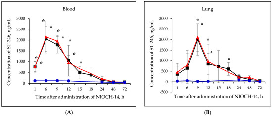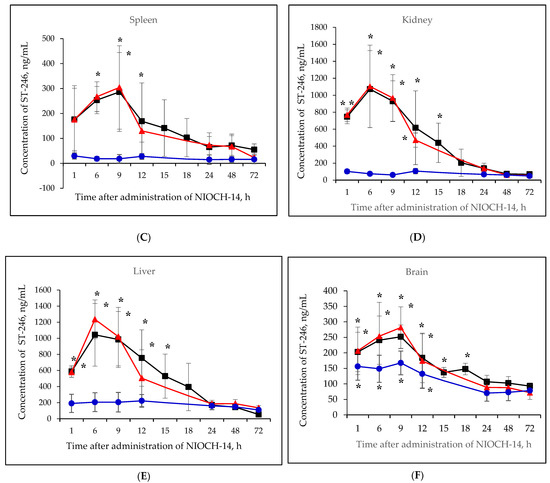 Changes in concentration of the active metabolite of NIOCH-14 (ST-246) in the mouse serum (A), lungs (B), spleen (C), kidneys (D), liver (E), and brain (F) after oral administration of the substance NIOCH-14. Single-dose administration of NIOCH-14 (50 µg/g body weight) (■). Administration of NIOCH-14 at a dose of 50 µg/g during 10 days (▲). Administration of NIOCH-14 at a dose of 5 µg/g during 10 days (●). Values in each point are presented as M ± SD. *—the difference from the threshold level (50 ng/mL) according to the Student’s t-test at p ≤ 0.05.