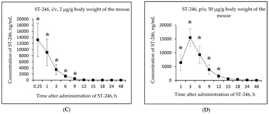 Changes in concentration of the active metabolite ST-246 in mouse serum as a function of time after single-dose intravenous (i/v) administration of the substance NIOCH-14 (2 µg/g body weight) (A) and single-dose oral (p/o) administration of the substance NIOCH-14 (50 µg/g body weight) (B). Changes in concentration of the reference drug ST-246 in mouse serum as a function of time after its single-dose i/v injection (2 µg/g body weight) (C) and single-dose p/o administration (50 µg/g body weight) (D). The values at each point are presented as M ± SD. *—the difference from the threshold level (20 ng/mL) according to the Student’s t-test at p ≤ 0.05.