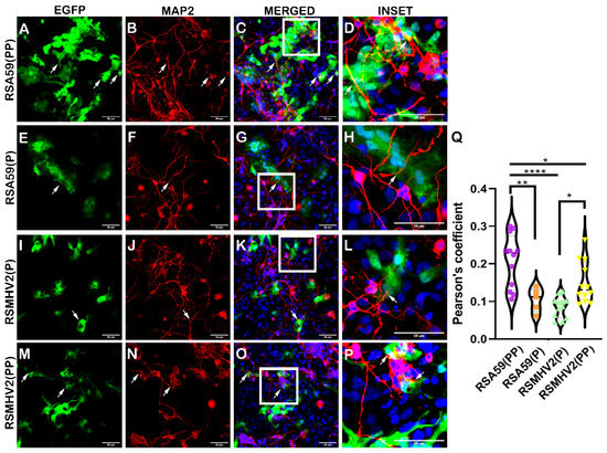 Infection of primary neuron enriched cultures with parental strains RSA59(PP), RSMHV2(P), one proline deleted RSA59(P), and one proline added RSMHV2(PP) mutants. Primary neuronal cultures isolated from day 0 C57BL/6 mice were infected with RSA59(PP) (A–D), RSA59(P) (E–H), RSMHV2(P) (I–L), and RSMHV2(PP) (M–P) at MOI 2. Cells were immunolabeled with MAP2 antibody at 24 h p.i. and counterstained with DAPI. Images presented show infected cells in the EGFP panels, and MAP2 panels indicate neurons in the culture. Merged panels show neurons with EGFP colocalization, with DAPI indicating the nucleus and arrowheads indicating infected cells. Panels (D,H,L,P) show colocalization in insets of higher magnification highlighted by a white rectangle area in the merged images. Quantified colocalization was presented in a violin diagram as the Pearson coefficient (Q). Experiments were performed three times in triplicate per strain (N = 9). The level of significance was taken at p < 0.05 following One-way ANOVA analysis. * p < 0.05, ** p < 0.001 and **** p < 0.00001.