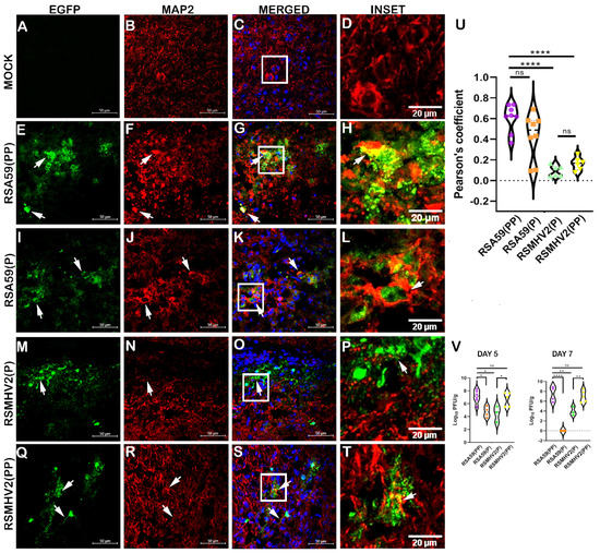 Colocalization study of two proline containing strains RSA59(PP), RSMHV2(PP) and single proline containing strains RSMHV2(P), RSA59(P) infected neurons in the brain of mice at day 5 p.i. Infected mice alongside control mock-infected mouse brain cryosections were immunofluorescently labeled with MAP2 antibody (B,F,J,N,R). EGFP panels indicate infected cells in the tissue (A,E,I,M,Q). Panels (C,G,K,O,S) show merged images of EGFP and MAP2 staining with arrowheads highlighting virus infected neurons. RSA59(PP) infected sections are in panel (E–H), RSA59(P) infected sections are in panel (I–L), RSMHV2(P) infected sections are in panel (M–P), RSMHV2(PP) infected sections are in panel (Q–T), and mock-infected sections are in panel (A–D). The insets marked by a white rectangle area in the merged panels show a magnified view of the colocalization of neurons with EGFP (seen as yellow) in panels (D,H,L,P,T). The amount of colocalization quantified as the Pearson coefficient was plotted in a violin diagram (U). Viral titer was performed at day 5 and day 7 p.i. to compare virus replication among RSA59(PP), RSA59(P), RSMHV2(P), and RSMHV2(PP). The results were plotted as a violin plot (V). The One-way ANOVA was used to compare RSA59(PP) with RSA59(P), RSMHV2(P), RSMHV2(PP), and RSMHV2(P) with RSMHV2(PP) infection. The level of significance was taken at p < 0.05, * p < 0.05, ** p < 0.001, **** p < 0.00001, and ns denotes non-significance.