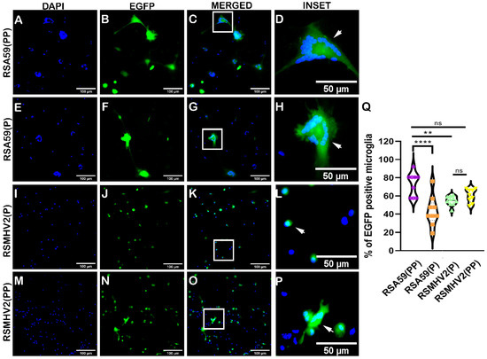 Differential infectivity and syncytia formation in primary microglia cultures infected with parental strains RSA59(PP), RSMHV2(P), one proline deleted RSA59(P), and one proline added RSMHV2(PP) mutants. Primary microglia cultures enriched from mixed glial cultures prepared from day 0–1 C57BL/6 mice pups were infected at MOI 2 with RSA59(PP) (A–D), RSA59(P) (E–H), RSMHV2(P) (I–L) and RSMHV2(PP) (M–P). Cells were counterstained with DAPI at 24 h p.i. Representative images show infected cells in the EGFP panels. Merged panels show the nuclei of infected cells and syncytia in insets marked by a white rectangle area in panels (C,G). A magnified view of insets marked by a white rectangle area is shown in panels (D,H,L,P). Percentages of infected cells in RSA59(PP), RSA59(P), RSMHV2(P) and RSMHV2(PP) infected cultures were quantified and plotted in a violin diagram (Q). The white-colored arrowheads in Insets panel indicates a cluster of infected cells. Experiments were performed three times in triplicate per strain (N = 9). The level of significance was taken at p < 0.05 following One-way ANOVA analysis. ** p < 0.001, **** p < 0.00001, and ns denotes non-significance.
