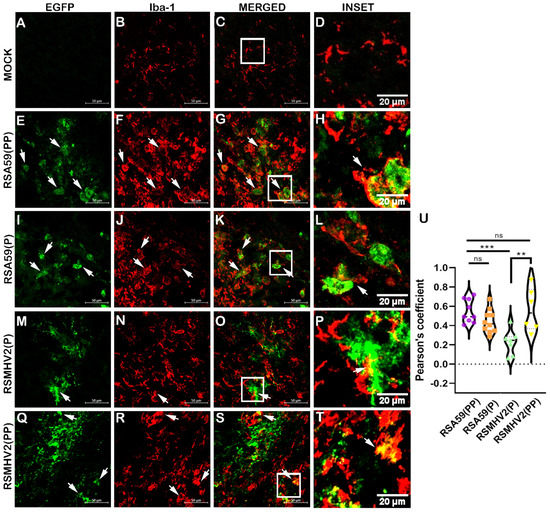 Colocalization study of two proline containing strains RSA59(PP), RSMHV2(PP) and single proline containing strains RSMHV2(P), RSA59(P) infected cells with microglia in the brain of mice at day 5 p.i. Cryosections of the brain of infected mice and mock-infected mice were immunofluorescently labeled with Iba-1 (B,F,J,N,R). EGFP marks the infected cells in panels (E,I,M,Q), and mock in panel (A). Green and red channels are merged (C,G,K,O,S) and show colocalization of EGFP with Iba-l-positive cells with arrowheads highlighting virus infected microglia. Mock infected sections are shown in panels (A–D), RSA59(PP) infected sections in panels (E–H), RSA59(P) infected sections in panels (I–L), RSMHV2(P) infected sections in panels (M–P), and RSMHV2(PP) infected sections in panels (Q–T). The insets marked by a white rectangle in the merged panels show a magnified view of the colocalization of microglia with EGFP (seen as yellow) in panels (D,H,L,P,T). Quantification of infected microglia as the Pearson coefficient was done and plotted in a violin diagram (U). The One-way ANOVA was used to compare RSA59(PP) with RSA59(P), RSMHV2(P), RSMHV2(PP), and RSMHV2(P) with RSMHV2(PP). The level of significance was taken at. ** p < 0.001, *** p < 0.0001, and ns denotes non-significance.