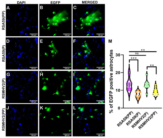Infection of primary astrocyte cultures with parental strains RSA59(PP), RSMHV2(P), one proline deleted RSA59(P), and one proline added RSMHV2(PP) mutants. Primary astrocyte cultures were infected with RSA59(PP) (A–C), RSA59(P) (D–F), RSMHV2(P) (G–I), and RSMHV2(PP) (J–L) at MOI 2 and counterstained with DAPI at 24 h p.i. Merged images of EGFP and DAPI channels presented show infected cells and their nuclei (C,F,I,L). The percentage of EGFP-positive cells in RSA59(PP), RSA59(P), RSMHV2(P), and RSMHV2(PP) infected cultures were quantified and plotted in a violin diagram (M). Experiments were performed three times in triplicate per strain (N = 9). The level of significance was taken at p < 0.05 following One-way ANOVA analysis. ** p < 0.001, *** p < 0.0001, and ns denotes non-significance.