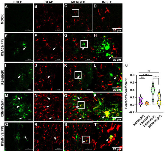 Colocalization of parental strains RSA59(PP), RSMHV2(P), one proline deleted RSA59(P), and one proline added RSMHV2(PP) mutants infected cells within astrocytes in the brain of mice at day 5 p.i. Cryosections of infected mouse brains and mock-infected mice were immunofluorescently labeled with GFAP (B,F,J,N,R). EGFP denotes infected cells in Panel (E,I,MQ) and mock-infected brain in panel A. Representative merged images of EGFP and GFAP channels (C,G,K,O,S) show colocalization of EGFP and GFAP-positive cells with arrowheads highlighting virus infected astrocytes. Mock sections are in Panel (A–D), RSA59(PP) infected sections are in panel (E–H), RSA59(P) infected sections are in Panel (I–L), RSMHV2(P) infected sections are in Panel (M–P), and RSMHV2(PP) infected sections are in Panel (Q–T). The insets marked by a white rectangle area in the merged panels show an area of magnified view of the colocalization of the astrocyte with EGFP (seen as yellow). Quantification of colocalization of astrocytes with the virus as the Pearson coefficient was done and plotted in a violin diagram (U). The One-way ANOVA is used to compare RSA59(PP) with RSA59(P), RSMHV2(P), RSMHV2(PP) and RSMHV2(P) with RSMHV2(PP). The level of significance was taken at, p < 0.05, **** p < 0.00001, and ns denotes non-significance.