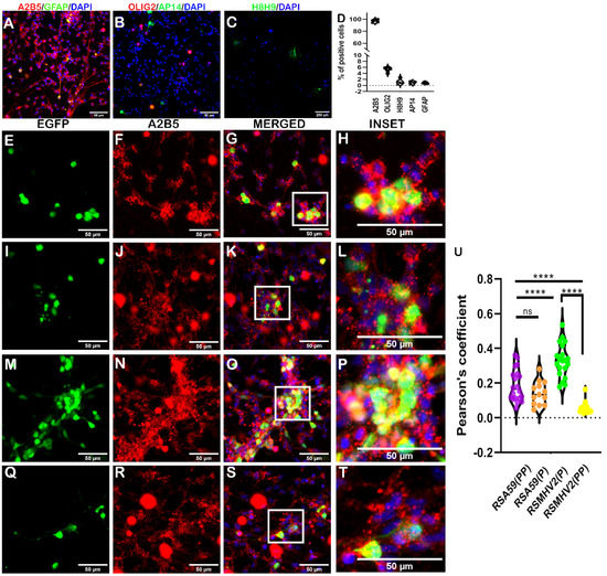 OPCs cultures were infected with RSA59(PP), RSA59(P), RSMHV2(P), and RSMHV2(PP) at MOI 2. After 24 h p.i., OPCs got infected with the four variants of the virus. RSA59(P) showed reduced infection compared to RSA59(PP) (Figure 7E,I). Surprisingly, RSMHV2(P) robustly infected OPCs significantly more than RSA59(PP) and RSMHV2(PP) (Figure 7M). We previously reported similar OPCs infection by RSA59(PP) and RSMHV2(P) [18]. EGFP-positive cells that were double positive for A2B5 were manually counted and plotted (Figure 7U).