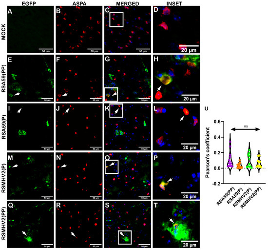 Colocalization of two proline containing strains RSA59(PP), RSMHV2(PP), single proline containing strains RSA59(P) and RSMHV2(P), infection within oligodendrocytes in the brain of mice at day 5 p.i. Cryosections of infected mouse brains and mock-infected mice were immunofluorescently labeled with ASPA (B,F,J,N,R). EGFP indicated infected cells in panels (E,I,M,Q), and a mock infected brain is shown in panel (A). Images of EGFP and ASPA were merged and DAPI counterstained (C,G,K,O,S) and show colocalization of EGFP and ASPA-positive cells with arrowheads highlighting virus infected oligodendrocytes. Infected brain sections from RSA59(PP), RSA59(P), RSMHV2(P), and RSMHV2(PP) are shown in Panels (E–H,I–L,M–P,Q–T), respectively. The insets highlighted by a white rectangle in the merged panels shows the area magnified view to show colocalization of oligodendrocytes with EGFP (D,H,L,P,T). The percentage of infected oligodendrocytes was determined and plotted in a violin diagram (U). The One-way ANOVA was used to compare RSA59(PP) with RSA59(P), RSMHV2(P), RSMHV2(PP) and RSMHV2(P) with RSMHV2(PP). The level of significance was taken at p < 0.05. ns denotes non-significance.
