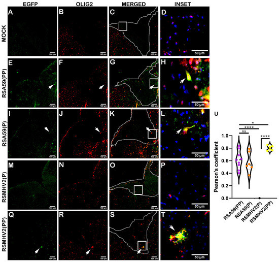 Colocalization of two proline containing strains RSA59(PP), RSMHV2(PP), and single proline containing strains RSA59(P), and RSMHV2(P) infection within mature oligodendrocytes in mouse spinal cords at day 5 p.i. Cryosections of infected mouse spinal cords alongside mock-infected mice were immunofluorescently labeled with Olig2 (B,F,J,N,R). EGFP denotes viral antigens in infected mice (E,I,M,Q) and mock-infected mice (A). Images of EGFP and Olig2 were merged with an outline of dorsal white matter highlighted in Panel (C,G,K,O,S). Arrowheads indicate virus infected oligodendrocytes. Higher magnification of colocalization of EGFP and Olig2-positive cells in the white matter is indicated as insets highlighted by a white rectangle area and are presented in panel (D,H,L,P,T). RSA59(PP) infected sections are shown in Panel (E–H), RSA59(P) infected sections are shown in Panel (I–L), RSMHV2(P) infected sections are shown in Panel (M–P), and RSMHV2(PP) infected sections are shown in Panel (Q–T). The percentage of infected oligodendrocytes in white matter was manually calculated and plotted in a violin diagram (U). The One-way ANOVA was used to compare RSA59(PP) with RSA59(P), RSMHV2(P), RSMHV2(PP) and RSMHV2(P) with RSMHV2(PP). The level of significance was taken at p < 0.05. * p < 0.05, **** p < 0.00001, and ns denotes non-significance.