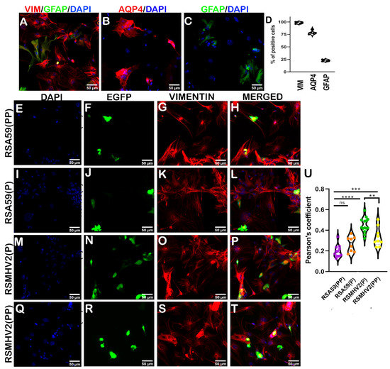 Characterization and infection of primary meningeal fibroblast cell cultures with two proline containing strains RSA59(PP), RSMHV2(PP), and single proline containing strains RSA59(P), and RSMHV2(P). Primary meningeal fibroblast cells enriched from meninges harvested from day 0–1 C57BL/6 pups were immunofluorescently characterized by double labeling with anti-vimentin (red; fibroblast marker) and anti-GFAP (green; astrocyte marker) (A), anti-aquaporin4 (red; matured fibroblast) (B), and anti-GFAP (green; astrocyte) (C). Cells were counterstained with DAPI. The data of the percentage of cells stained positive for the three markers were plotted (D). Primary meningeal fibroblast cell cultures were infected with RSA59(PP) (E–H), RSA59(P) (I–L), RSMHV2(P) (M–P), and RSMHV2(PP) (Q–T) at MOI 2. After 24 h p.i., cells were fixed and immunofluorescently labeled with vimentin and counterstained with DAPI. Representative images show infected cells in the EGFP panels (F,J,N,R) and vimentin-positive cells in the panels (G,K,O,S). Merged panels show colocalized EGFP and vimentin-stained cells. Quantification of the percentage of double-positive EGFP and vimentin cells is presented in a violin diagram (U). Experiments were performed three times in triplicate per strain (N = 9). The level of significance was taken at p < 0.05 following One-way ANOVA analysis. ** p < 0.001, *** p < 0.0001, **** p < 0.00001, and ns denotes non-significance.
