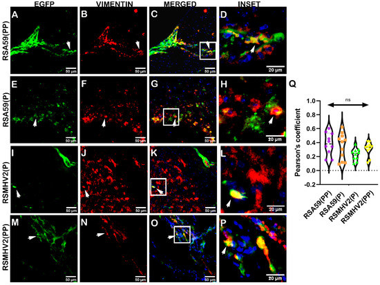 Colocalization of two proline containing strains RSA59(PP), RSMHV2(PP) and single proline containing strains RSMHV2(P) and RSA59(P) infection with choroid plexus fibroblasts in the brain of mice at day 5 p.i. Cryosections of infected mouse brains were immunofluorescently labeled with vimentin (B,F,J,N). EGFP images denote infected cells in the tissue (A,E,I,M). Images in panels (C,G,K, O) show the merged EGFP and vimentin, with insets marked by a white rectangle area and arrowheads highlighting virus infected fibroblasts. RSA59(PP) infected sections are shown in panels (A–D), RSA59(P) infected sections are shown in panels (E–H), RSMHV2(P) infected sections are shown in panels (I–L), and RSMHV2(PP) infected sections are shown in panels (M–P). A magnified view of the insets in the merged panels showed the colocalization of EGFP with vimentin-positive cells (seen as yellow) in panels (D,H,L,P). The degree of colocalization as the Pearson coefficient was plotted in the violin diagram (Q). The One-way ANOVA was used to compare RSA59(PP) with RSA59(P), RSMHV2(P), RSMHV2(PP) and RSMHV2(P) with RSMHV2(PP). The level of significance was taken at p < 0.05. ns denotes non-significance.