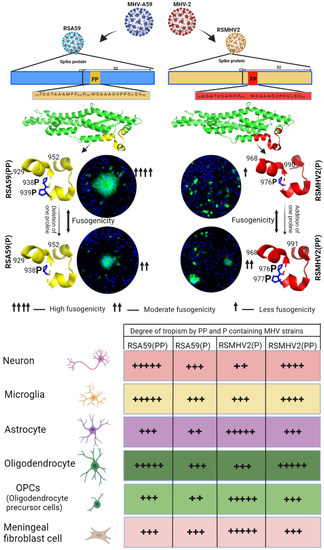 The β-Coronavirus mouse hepatitis virus (MHV-A59)-RSA59 has a patent stretch of fusion peptide (FP) containing two consecutive central prolines (PP) in the S2 domain of the Spike protein. Our previous studies compared the PP-containing fusogenic-demyelinating strain RSA59(PP) to its one proline-deleted mutant strain RSA59(P) and one proline-containing non-fusogenic non-demyelinating parental strain RSMHV2(P) to its one proline inserted mutant strain RSMHV2(PP). These studies highlighted the crucial role of PP in fusogenicity, hepato-neuropathogenesis, and demyelination. Computational studies combined with biophysical data indicate that PP at the center of the FP provides local rigidity while imparting global fluctuation to the Spike protein that enhances the fusogenic properties of RSA59(PP) and RSMHV2(PP). To elaborate on the understanding of the role of PP in the FP of MHV, the differential neuroglial tropism of the PP and P mutant strains was investigated. Comparative studies demonstrated that PP significantly enhances the viral tropism for neurons, microglia, and oligodendrocytes. PP, however, is not essential for viral tropism for either astroglial or oligodendroglial precursors or the infection of meningeal fibroblasts in the blood–brain and blood–CSF barriers. PP in the fusion domain is critical for promoting gliopathy, making it a potential region for designing antivirals for neuro-COVID therapy.